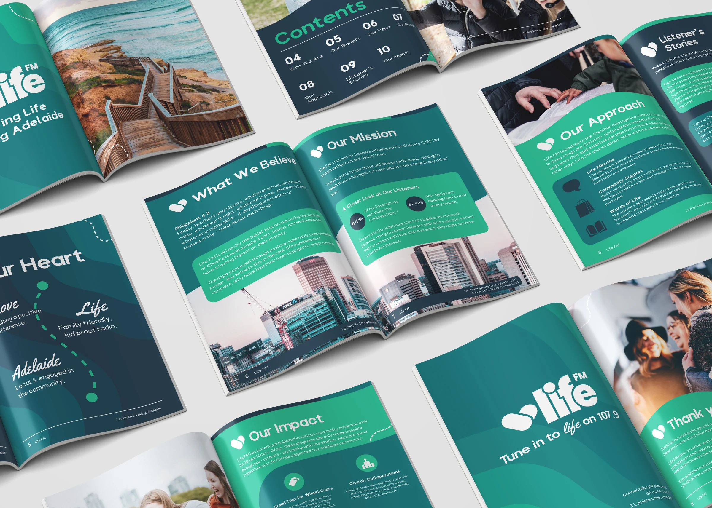We started by understanding what Life FM means to its listeners, stakeholders, and team. From there, we developed a brand strategy that captured the station's heart, then designed a complete visual identity system. The rollout covered every touchpoint, from broadcast graphics and signage to business cards, social media, print collateral, and a comprehensive brand guidelines document.